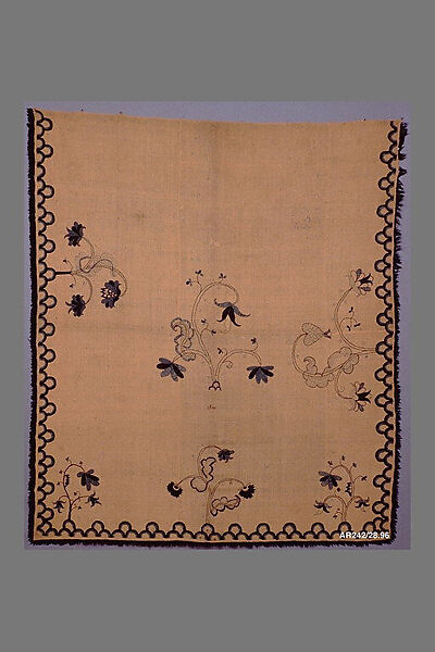 The cream-colored wool ground of this bed cover is embroidered with light and dark blue wool in flat stitch, chain stitch, outline stitch, and small dotlike running stitches. The central area is decorated with six small flowering trees. The border is in a "hillock" pattern. The wool ground is made up of three panels seamed together. There is a dark blue wool fringe on three sides.