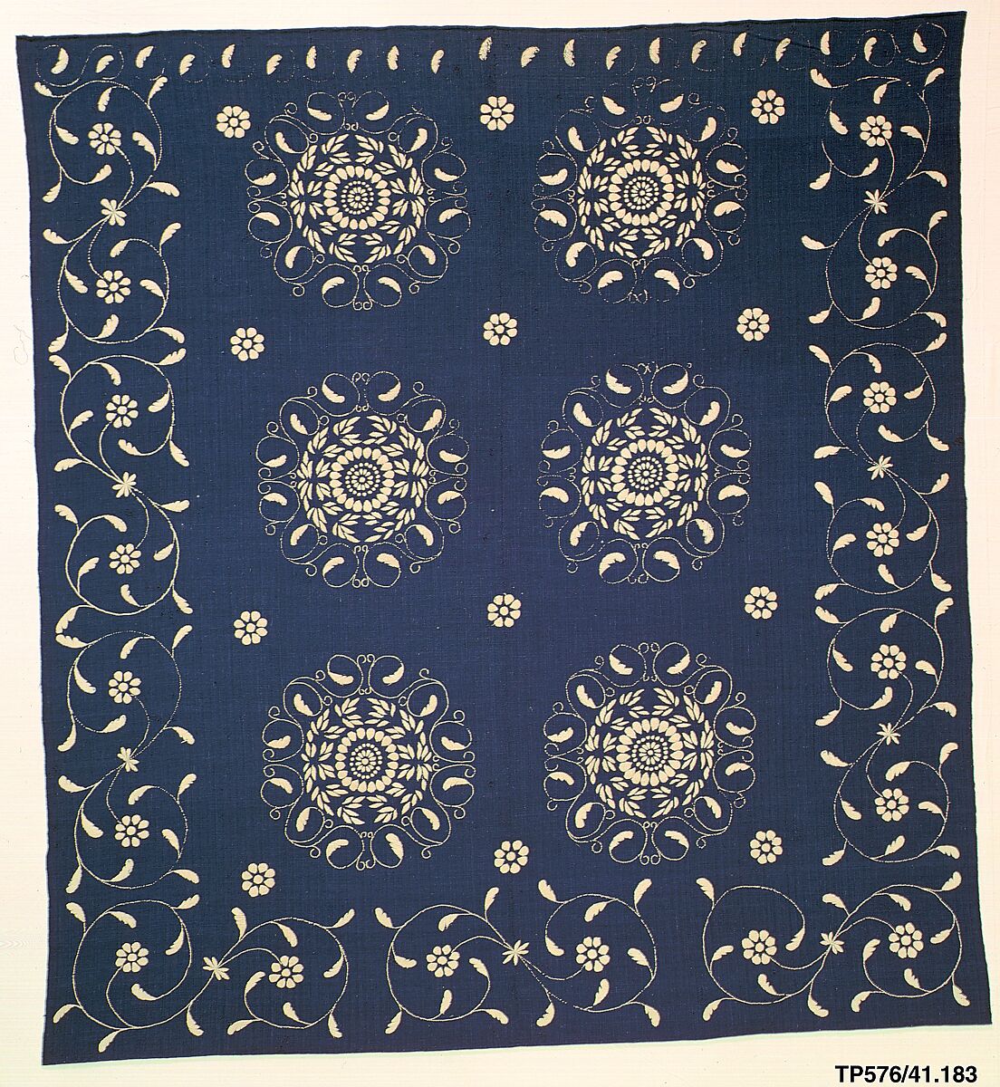 The dark blue twill-woven ground of this blanket is embroidered in heavy white cotton thread with economy stitches and stem stitches. The central area is decorated with large medallions. Three sides are bordered with embroidered vines, and the top edge has small embroidered leaves. The piece is made of two panels of fabric, which have been seamed at the center.