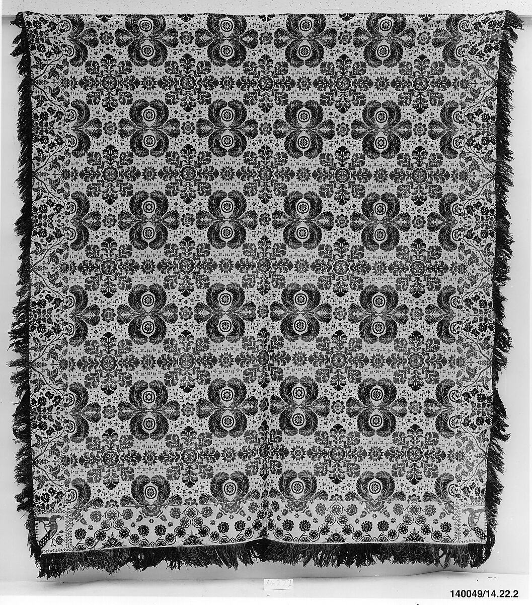This coverlet is woven in two panels and seamed at the center. It has a warp of undyed and light blue cotton and a weft of dark blue, green, and red wool and undyed cotton. The central field shows feather medallions alternating with foliate medallions. The bottom border has a stylized vine motif, and the right and left borders have roses and tulips. Peacocks adorn each of the two corner blocks. Both sides of the coverlet have natural fringe, and there is attached fringe along the bottom edge.