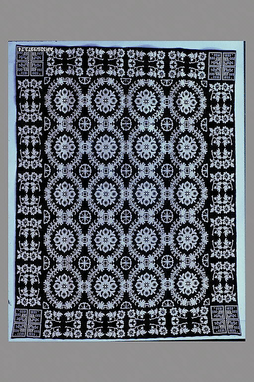 This dark blue wool and undyed cotton double cloth coverlet is woven in two panels and seamed at the center. It is patterned with unusual floral medallions alternating with a spoked wheel design. The border is decorated with a simple design of repeating floral sprigs.