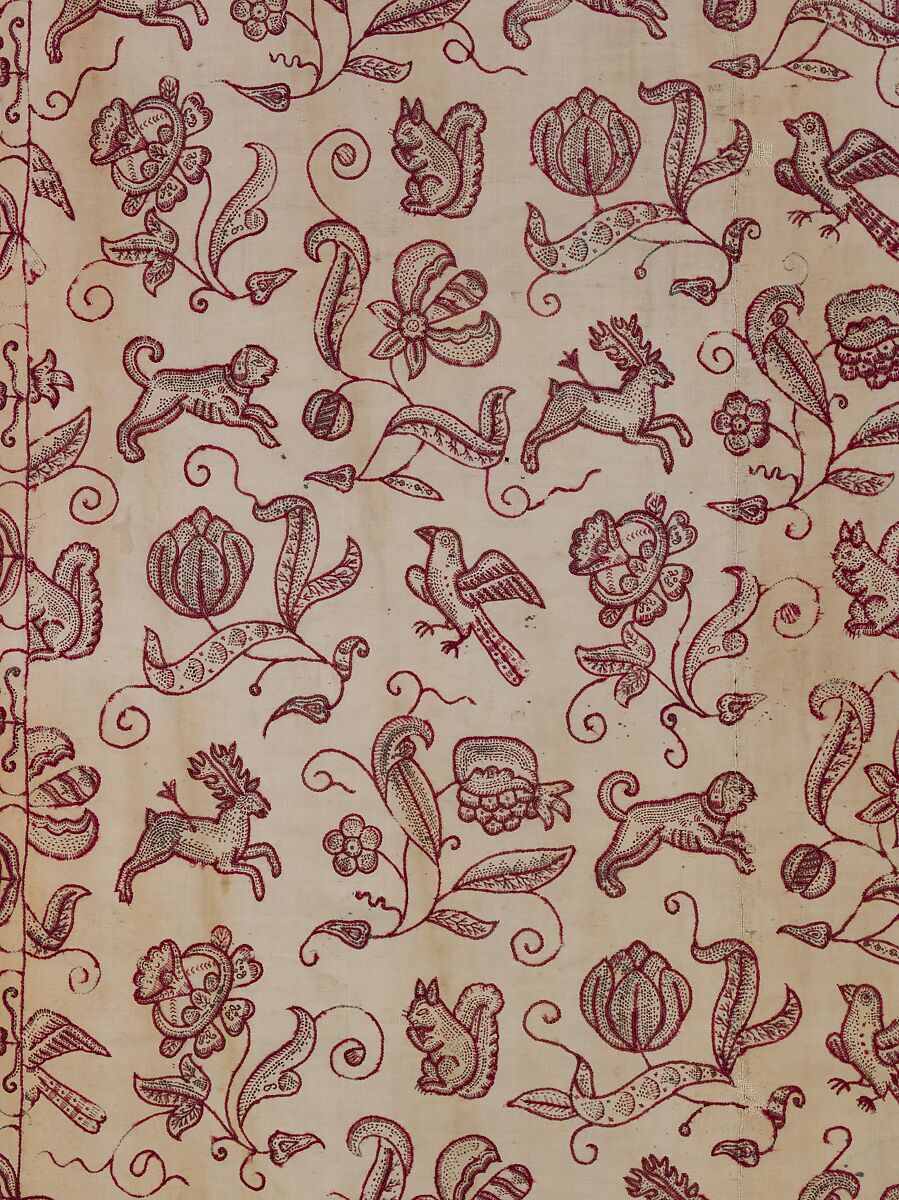 A profusion of carefully organized motifs rendered in red wool thread appears on the cream-colored foundation of this bed curtain. The panel descended in the Clapp family, members of which emigrated from England to Charleston, South Carolina, in 1680. While the bed hangings may have been embroidered in the New World, the pattern was stamped on the fabric in England—the black ink outline is still visible.