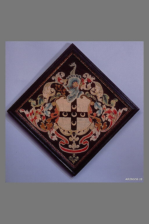 These diamond-shaped coats of arms represent the various kinds of intricate crafts practiced by young women in eighteenth-century New England. In demonstration of their accomplished domestic talents, female family members executed these decorative emblems at schools for young ladies where they copied an appealing coat of arms from a pattern book. Coats of arms were made either in embroidery or quillwork, a technique of tightly curled paper shaped into a design, frequently embellished with crushed glass, mica, and pearls. However, embroidered coats of arms with silk and precious metallic threads on a black silk background were more common. Although lacking the royal social hierarchy of Great Britain, many of Boston’s merchant class families adopted coats of arms to imply heraldic ancestry and reflect their wealth and social position.
