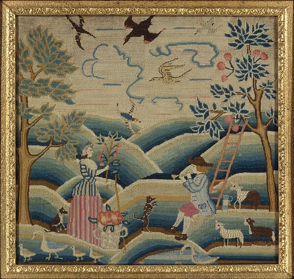 European engravings of romanticized country life, especially of courting shepherds and shepherdesses (as seen on 39.108.1) were readily available in the American colonies, and in the mid-eighteenth century, were often turned to as inspiration for schoolgirl needlework designs. Another favorite design taken from engravings showed the gentry riding out on a foxhunt (39.108.2). Although it is unlikely that there were frequent foxhunts taking place in the American colonies, the popularity of this often-used scene may be attributed to the firm alignment affluent colonists, those well-to-do enough to have their daughters schooled in such ornamental embroideries, felt with the genteel society of the mother country.
