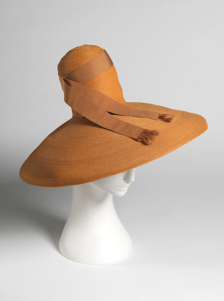 Having designed for film and theater for many years, Adrian was accustomed to researching historical dress in preparation for creating costumes that would evoke a particular period. When he turned to fashion design, he similarly drew on historic sources for inspiration, but with the intention of integrating elements of past styles into current fashions without creating a costumed effect. Adrian’s fall 1943 collection was notable for the prevalence of hat styles displaying the influence of medieval headwear, including hoods, wimples, and hennins. This hat, with its broad, downward-sloped brim, resembles functional straw hats worn by both men and women during the Middle Ages to shield their faces from the sun, and its high crown echoes the steeple-like form of the hennin, a tall headdress common in France in the second half of the fifteenth century. The overall effect, however, was in harmony with contemporary fashionable dress.