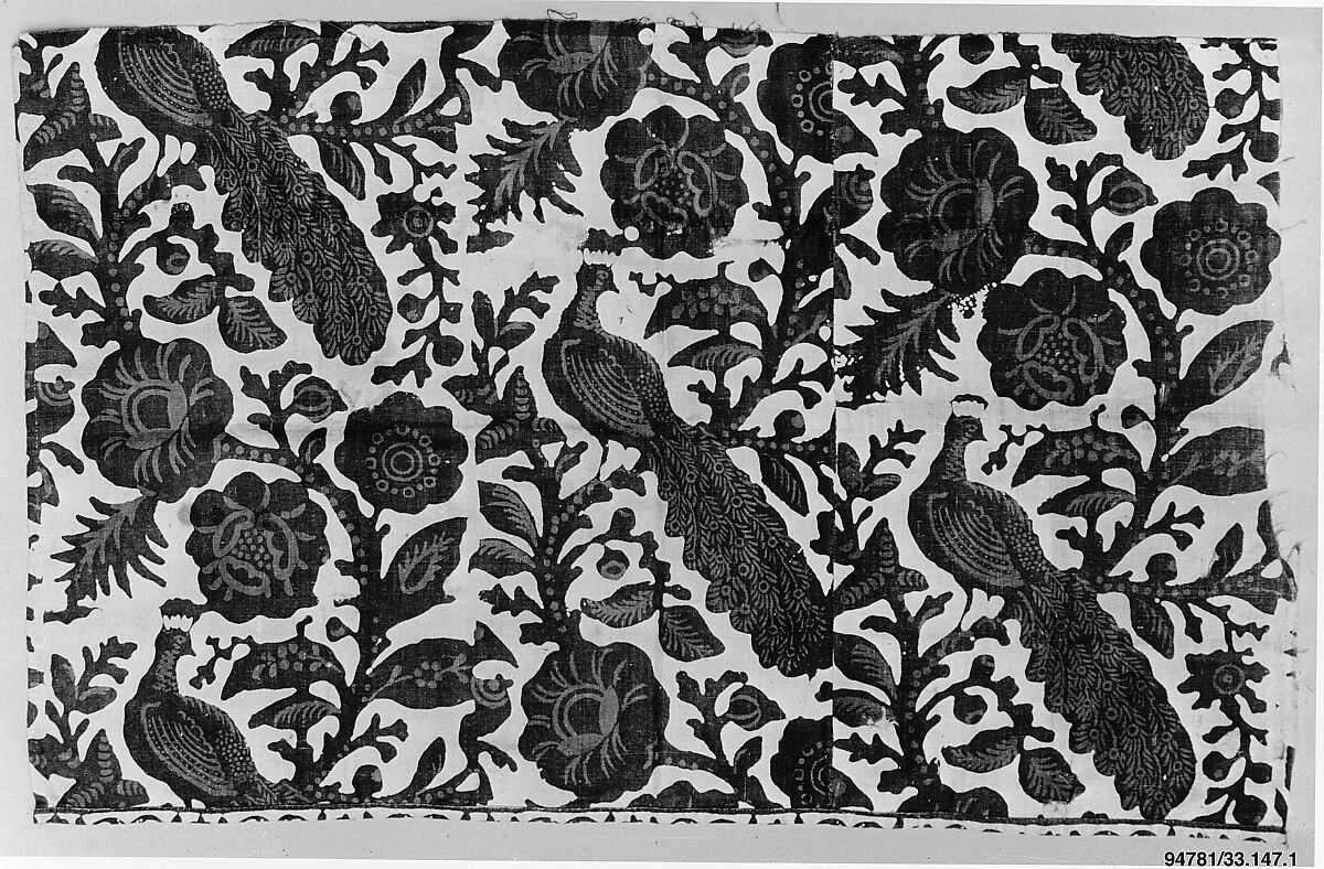 However, after years of study most scholars concluded that since there was little documentary evidence of mid-eighteenth-century American textile production, and because there was one extant piece with a British excise tax stamp, these textiles had to have been made in England and exported to the American colonies. But there remained a problem with this supposition, as no blue resist fabric has been found in England. Instead, after recent research, it seems most likely that these textiles were exported by the English East India Company from India to the colonies. Several sources of evidence lead to this conclusion. Resist-dyeing with indigo was common in India at least as early as the thirteenth century, and the all-cotton white base fabric is certainly Indian—the English did not perfect weaving pure cottons until the 1770s. American merchant’s orders exist requesting this type of fabric from their East India Company suppliers. And at the time these fabrics were produced, there was a ban on importing Indian printed fabrics into England where they were perceived as in competition with English printed goods, but that ban did not hold for the North American colonies. It is possible that these decorative, yet simply printed furnishing textiles would not have appealed to the more refined European market. However, as bed hangings, quilts, and curtains, they brightened up the homes of many American colonists.