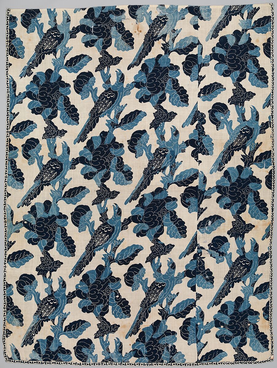 Determining the country of origin of this blue-resist fabric frustrated several generations of American textile historians. It is found in abundance in museums with major American textile collections, most often acquired between the 1920s and 1960s. It entered those collections as examples of rare, early American-made fabric. The pieces were often accompanied by family histories that attested to original ownership in New York’s Hudson River valley or Long Island, or sometimes coastal Connecticut. Interestingly, many of these histories trace the popularity of this type of fabric to eighteenth-century families who had emigrated from Netherlands.