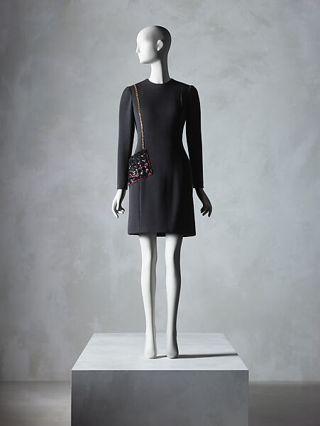 This work of art is currently on loan to the museum.In his book The Language of Fashion, philosopher Roland Barthes describes Gabrielle Chanel as an author who successfully utilized clothing to cultivate the “authority and the panache of a writer of the classical age.” In 1983, twelve years after Chanel’s death, Karl Lagerfeld assumed creative directorship of the house. Over a period of thirty-six years, he followed in the path of the founder, distilling the heritage of the brand to a basic lexicon, which he continuously explored with originality and humor. Among the key iconographic elements he deemed essential was the ubiquitous quilted handbag that was introduced by Gabrielle Chanel in 1955. Lagerfeld consistently reimagined the accessory itself and also employed aspects of it as a motif in clothing. Here, the handbag has been embroidered across the left hip of the dress in a glimmering trompe l’oeil blanket of sequins and beads. In an amusing gesture, the purse is not solely decorative, but contains a cleverly concealed and functional pocket.