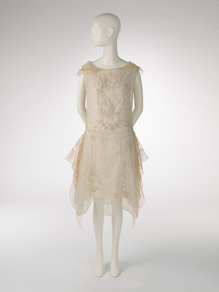 This work of art is currently on loan to the museum.The whimsical embroidered illustrations on this Boué Soeurs frock are particularly remarkable. Meandering vines of flowers entwine to form a frame around the bodice and skirt that encloses a pair of lissome dancers, their bodies in motion with limbs gracefully arcing skyward. The exotic costumes that clothe the figures evoke the aesthetics of the fashionable Parisian dance ensemble the Ballets Russes (1909–1929), founded by the Russian art critic Serge Diaghilev. Though the delicate pastel materials of this garment may seem antithetical to the typically bold exoticism associated with Diaghilev’s company, the stylized embroidery captures the troupe’s spirit and attests to its cultural impact.