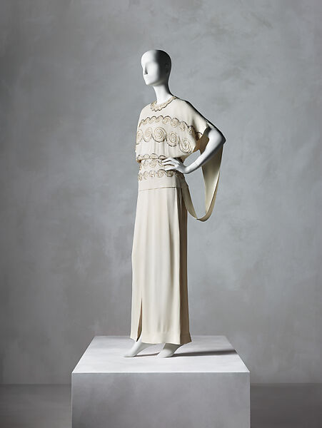 Adrian was confident in the ability of American designers to put forward a distinct perspective, and he played an important role in advancing American fashions that diverged from Paris’s model in terms of design sensibility and approach to production. Years before ready-to-wear fashions were common in France, innovative American designers were producing ready-to-wear that exhibited the impeccable craftsmanship typically associated with custom-made clothing. His own ready-to-wear label, Adrian Original, featured skillfully cut, draped, and finished garments such as this sleek evening dress embroidered with a Greco-Roman-inspired wave pattern in gold sequins.