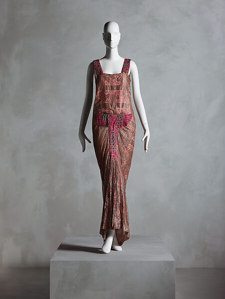 This work of art is currently on loan to the museum.Designs by the French house Madeleine & Madeleine are distinguished by sumptuous fabrics and rich embroidery, as seen in this evening dress. The gown’s primary motif of ibises, along with its center pleating and girdle of imitation stones, reflects the heightened influence of ancient Egypt on fashion following the discovery of Pharaoh Tutankhamun’s tomb in 1922.