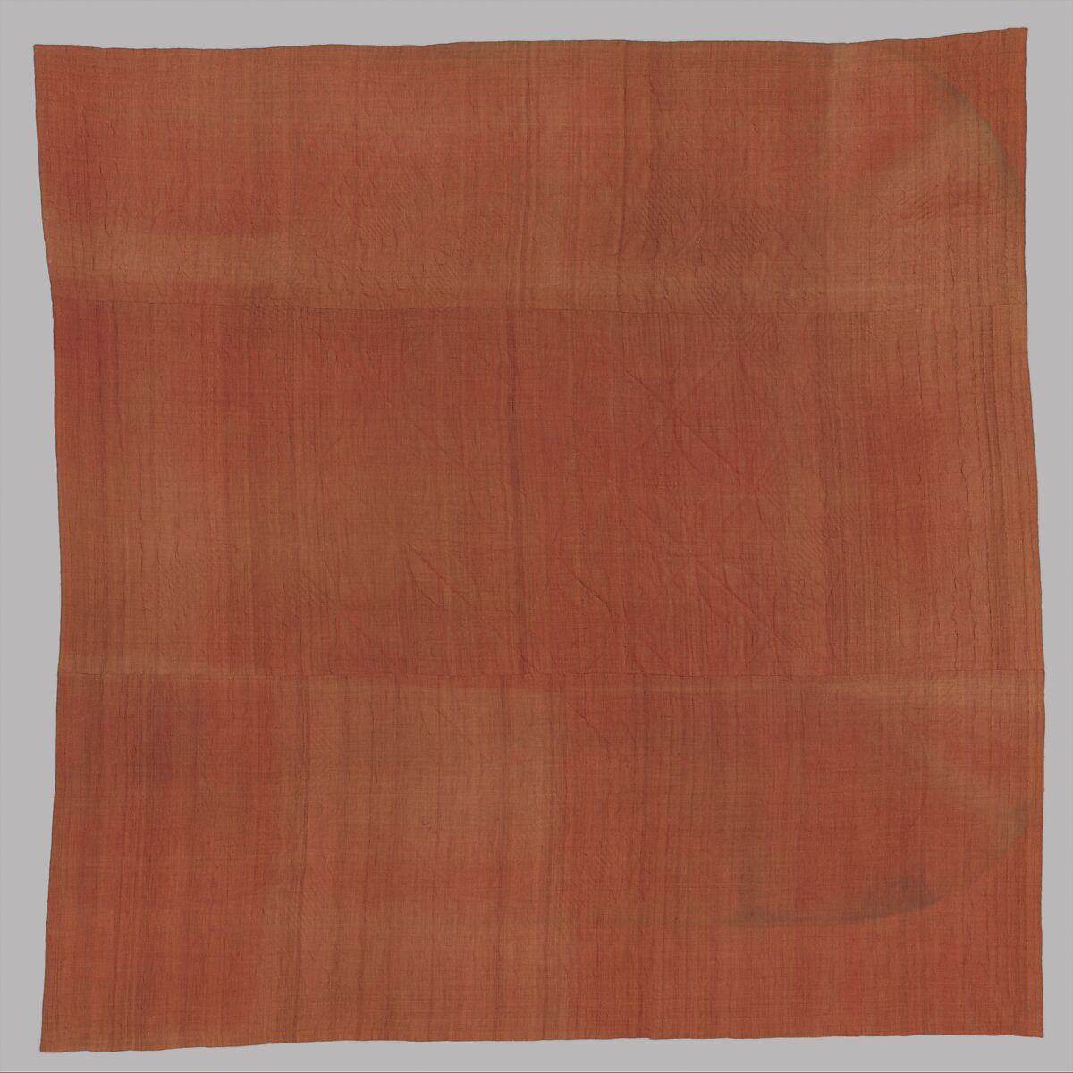 The top of this quilt is of a rust-colored glazed wool, and the back is of a coarsely woven gold cotton. The top is made of three panels of fabric, the widest g7G inches. The piece is quilted with a central area of quatrefoils, a feather-vine border, and pyramids of shells.