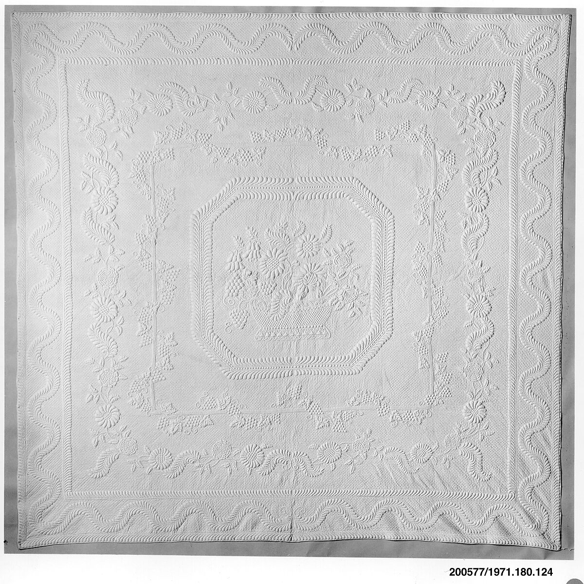 Stuffed, embroidered, and woven versions of all-white bedcovers were popular during the first third of the nineteenth century. Stuffed whitework quilts such as this one were often made to be included in a bride's wedding outfit. They were particularly prized, possibly because of the sheer amount of labor that went into them. After joining the top and back layers, a young woman outlined the edges of each flower petal or leaf with tiny stitches. Then, she carefully opened spaces in the backing by pushing aside the woven threads of the cloth with her needle. After a tiny area was opened, she inserted small bits of cotton stuffing between the top and back layers in order to produce the raised areas of the design. When an area was stuffed to her satisfaction, the backing fabric was closed by pushing the threads back to their original position. When all of the stuffing was complete a final tightly woven layer of backing was stitched to the quilt. This quilt, which is one of the most beautiful of all the whitework pieces in our collection, must have taken a great deal of time to complete.
