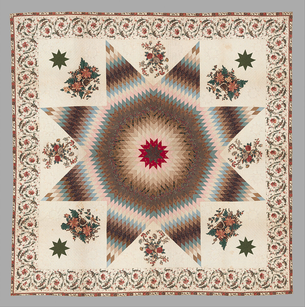 Although the provenance of this exquisite Star of Bethlehem quilt is not known, it was most likely made in one of the southern states. Quilts in which a central Star of Bethlehem motif is combined with chintz-appliquéd blocks and a chintz border, as it is here, have been found in Maryland, Virginia, and North and South Carolina. It is tempting to conclude that this quilt originated in Maryland. For one thing, it exemplifies the very fine workmanship characteristic of the tradition of high-style quiltmaking that arose in Baltimore in the 1820s and reached its zenith with the famous Album quilts of the 1840s (see 1974.24 and 1988.134). A more fanciful reason for a Maryland attribution is the presence of Baltimore orioles on the four corner blocks, which are appliquéd with an English chintz printed with pairs of these birds. When this quilt was made, the American market was still dependent on England for well-printed chintzes, and naturally, American birds pleased the American buyer. The fabrics of this quilt's appliqués and border are English, while the printed cottons pieced into the central star are most likely of American manufacture. There is no quilting at all in the pieced star. The rest of the surface is worked with particularly fine and even diamond-and-square quilting, and the white areas are enlivened with ten-pointed stuffed-work stars.