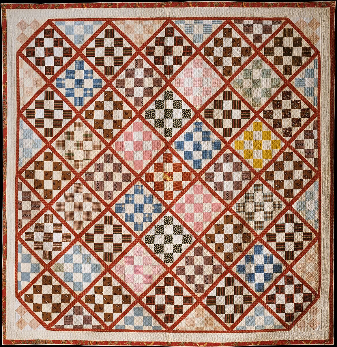 This Nine Patch quilt, along with two others in the Museum’s collection (1980.498.1 and 1980.498.3) were made by Rebecca Davis, grandmother of the donor, Mrs. Andrew Galbraith Carey. Although this example is not signed, it can be assumed that all of Davis’ quilts in the collection were made sometime around 1846, since her Honeycomb quilt (1980.498.1) is dated to that year and all three share some of the same fabrics. Most of the fabrics sewn into these quilts appear to be English printed cottons, an attribution confirmed by the sections of English design-registration marks visible on a number of the pieces.