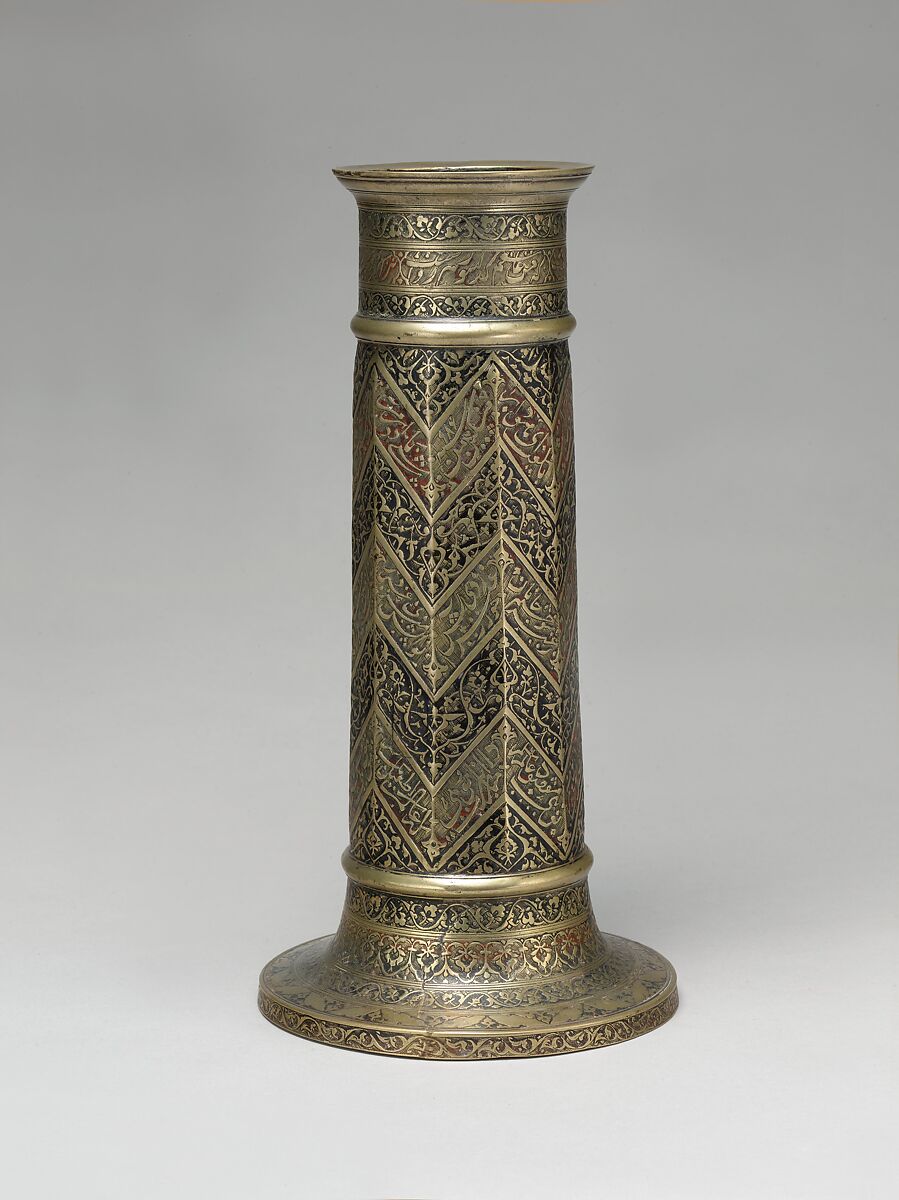 The poetry inscribed around this lamp stand expresses mystical Sufi sentiments. Lyrical verses from the Bustan (Orchard) of Sa'di are placed in three zigzag-shaped registers covering the shaft: