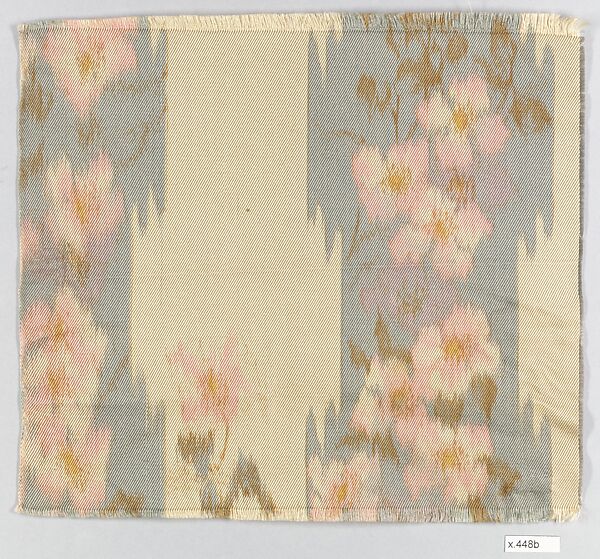 This "shadow silk" with an apple-blossom pattern is unusual for Associated Artists in having stripes provide the organizing framework for the composition. Candace Wheeler (1827-1923) and her colleagues rarely arranged their floral motifs in such overtly regimented fashion, preferring to compose them into a loosely meandering network and disguise the inherently repetitive nature of the printed pattern. However, this textile, which is probably a late design, is modeled after highly structured eighteenth-century French fabrics both in pattern and in printing technique. Like many other designers, Wheeler turned away in the 1890s from the exoticism of the two previous decades and returned to historical European styles for inspiration.