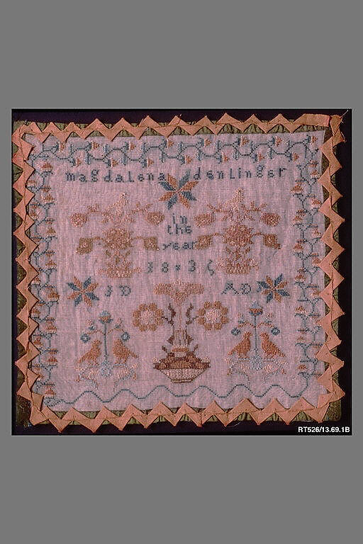 The Met has another sampler made by Magdalena’s older sister, Anna Denlinger (1818-1883) (13.69.1a) that follows a similar format. The rural lifestyle of Pennsylvania Mennonite families meant that they were more likely to learn to sew at home rather than at an established school, and Magdalena and Anna may have copied a sampler made by their mother. It is interesting to compare samplers made by relatives using the same design source, because each interprets the motifs in their own way. For example, Anna uses a pair of traditional seven-armed heart motifs with the accompanying letters OEHBDDE, while Magdalena stitched a pair of more Anglicized motifs as a basket of flowers topped by a chirping bird and did not include the traditional letters that represent the major syllables in the verse “O Edel Herz Bedenk Dein End” (O Noble heart, think on thine end).