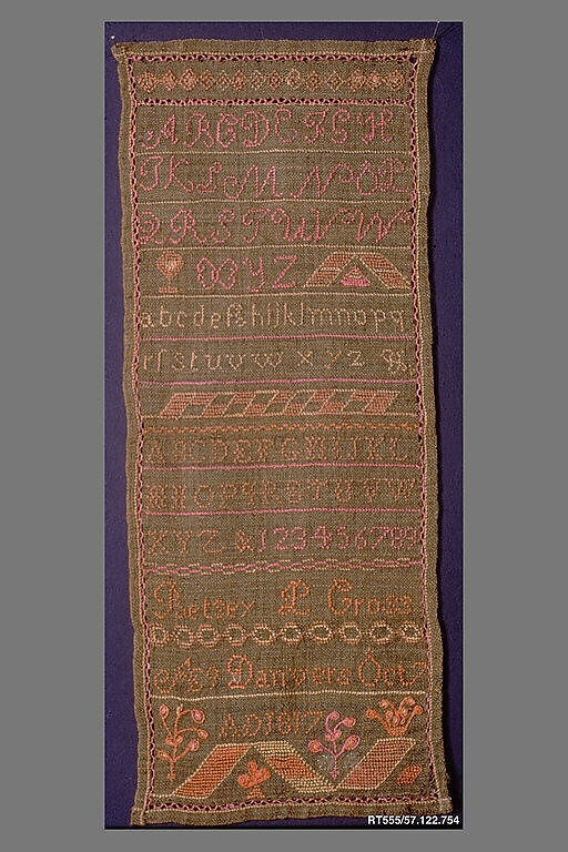 Worked on a green “linsey-woolsey” ground distinctive to many samplers made in Essex County, Massachusetts, this marking sampler reflects seven-year-old Betsey Cross’s mastery of embroidery stitches and reinforces her literacy skills. Guided by her mother or the female instructor at a school for young children, commonly called “dame schools,” Betsey arranged fourteen rows of finely worked letters, numerals, and simple decorative motifs in a long narrow format more typical of eighteenth-century samplers. The brightly colored silk stitches stand out against the dense green ground.