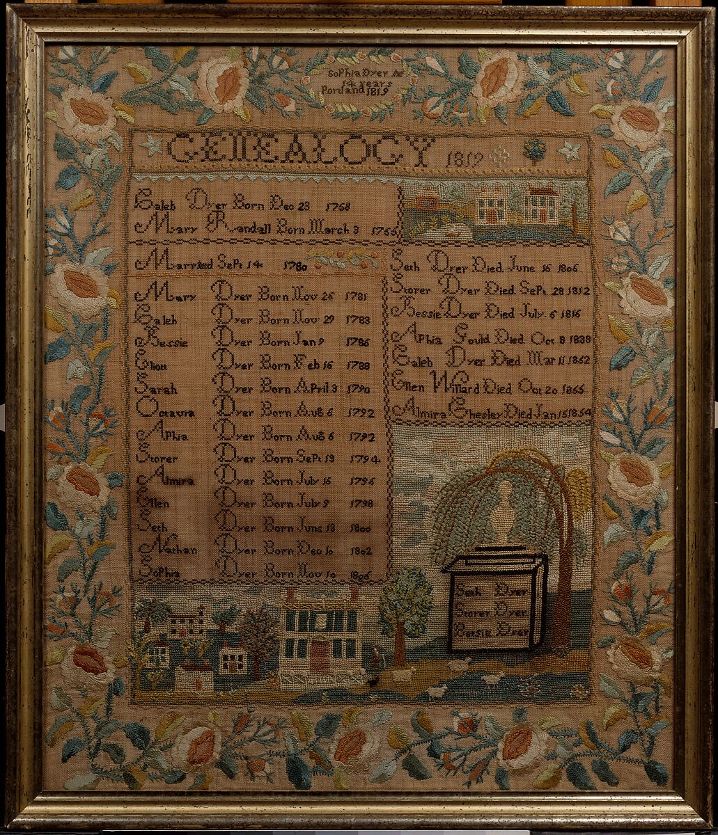 While the early generations of the Dyer family have been well recorded, and Sophia’s sampler documents her immediate family members, her adult life is difficult to track down. She had a cousin named Sophia Dyer (b. 1804), the daughter of Ezekiel and Mary Dyer, also of Cape Elizabeth, whose sampler in the Portland Museum of Art is dated July 14, 1817. Genealogical sources have confused the two girls. Nevertheless, the survival of our Sophia’s sampler is a testament to her embroidery skills as well as being the only remaining primary source documenting of her family.