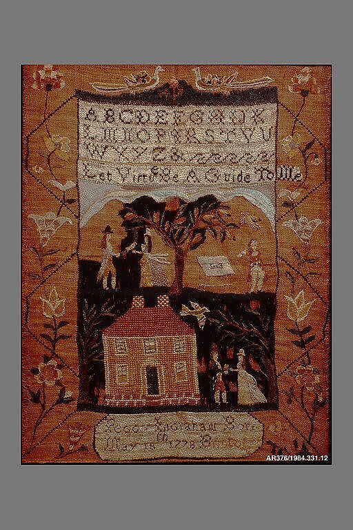 Peggy Ingraham’s sampler is one of two in The Met’s collection from an appealing group of Bristol, Rhode Island samplers that are attributed to the school of Anne Bowman Usher (1723-1793). The four known samplers worked at Mrs. Usher’s school between 1790 and 1793 share several embroidered motifs -- animated courting couples, a serenading flute player reading from a score on a music stand, and long-tailed birds, as seen on both Peggy’s sampler and that of her classmate, Martha “Patty” Coggeshall (14.26). Also characteristic of Mrs. Usher’s school, both samplers display a streaky sky, and in the worked alphabet, the letter “V” precedes the letter “U”. Peggy inscribed her name, birth date, and “Bristol” in a cartouche at the bottom of her sampler. Unlike the other Usher school samplers, she added a carefully worked three-bay Federal house with the first-floor windows open to bring in fresh air; and left her black background largely unfinished.