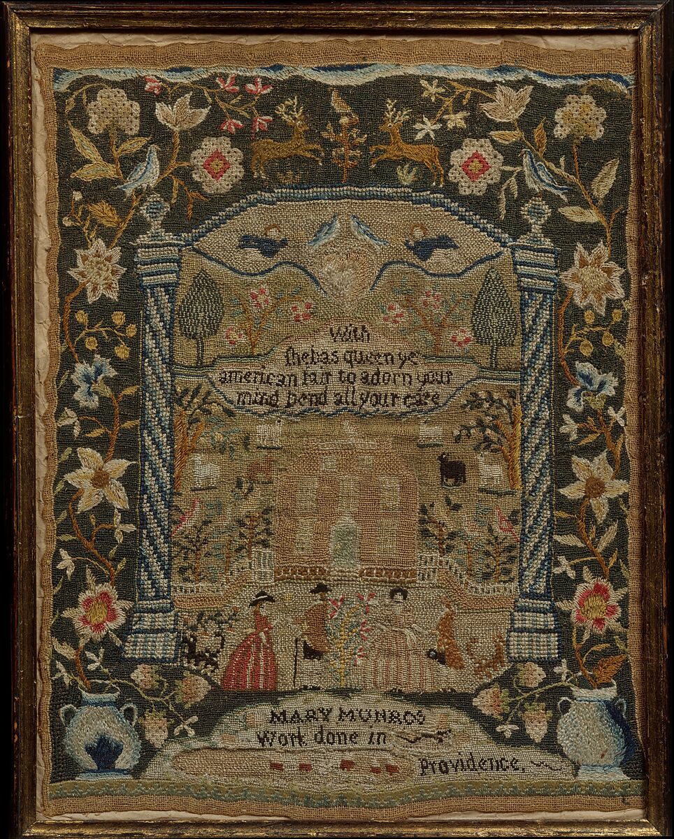 This carefully stitched sampler displays an overall design of floral motifs, elegant men and women in eighteenth-century dress, grazing animals, and built structures. It is typical of the earliest samplers to survive from the Balch school. Worked in a variety of stitches, Mary’s border consists of richly colored meandering floral vines emanating from large two-handled urns on a dark green background. The two striped blue columns enclose the multi-tiered center of the sampler. At the top register two stags prance over a flattened arch below which a pair of birds perch on a heart, flanked by trumpeting angels--a design detail characteristic of Balch school samplers.