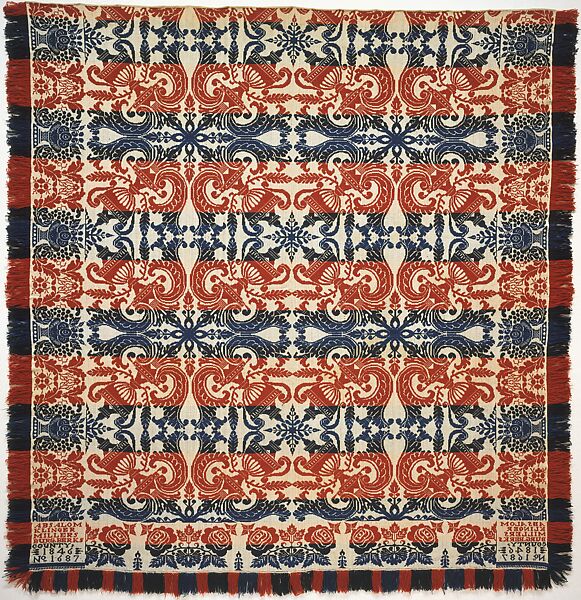 This coverlet is woven in one wide panel. The field is decorated with quadrupled urns, and the left and right borders show bowls of fruit. The piece is striped with bands of medium blue, dark blue, and red wool. The undyed cotton warp threads alternate with light blue cotton tie-down threads. The piece is fringed on three sides; the two side fringes are natural, and the fringe along the bottom is attached.