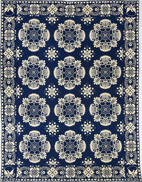 This dark blue wool and undyed cotton coverlet is woven in two panels and seamed together at the center. The central field is decorated with medallion forms. The wide inner border shows floral and diamond motifs, while the narrow outer border has alternating hearts and diamonds. There are four corner blocks, each with an eagle surmounted by thirteen stars.
