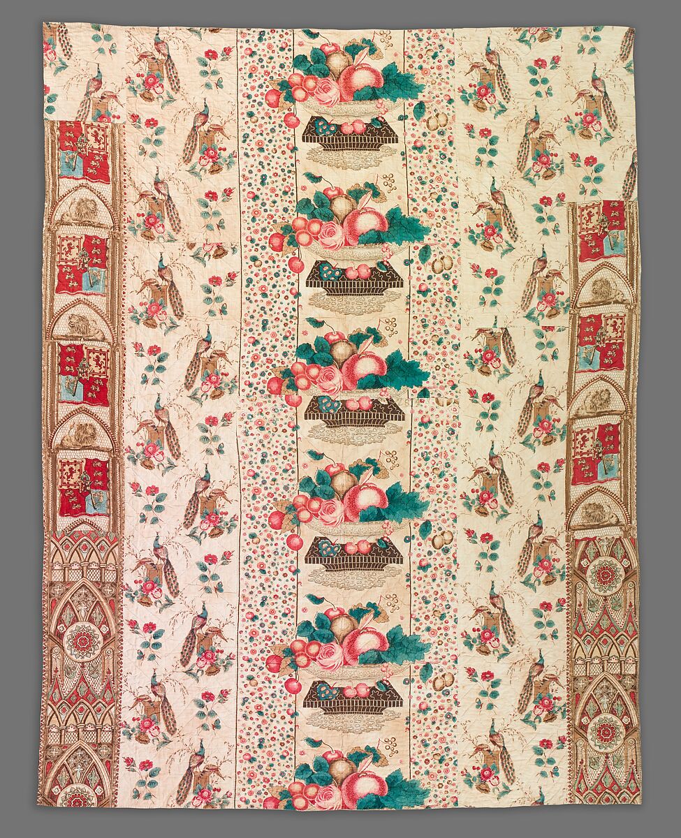 Fabric (and wallpaper) designers of the mid-nineteenth century enjoyed realistic trompe l'oeil effects, as can clearly be seen from this quilt. The white ceramic bowls laden with fruit and a single pink rose have the same luscious quality as the hand-colored floral prints of the period. The other fabrics make little sense with the center panel, which is immediately surrounded by strips of fabric showing small peacocks on pedestals. The presence of peacocks speaks to the century-long popularity of peacocks as subjects for textile design. The outermost, incomplete stripes of fabric contain two different imported English cottons printed with Gothic window tracery. One of these fabrics includes a flag showing the British Royal Standard as it appeared between 1814 and 1837. When Queen Victoria ascended the throne in 1837, the standard was changed, and no longer included the Hanoverian Crown in the center as seen here. This helps us date this particular fabric to before 1838.