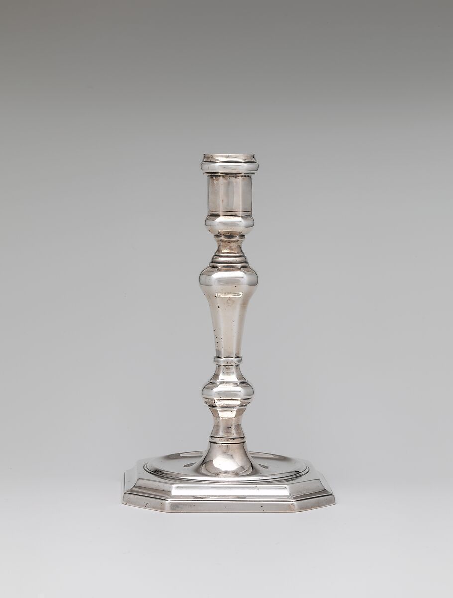 Early American candlesticks are extraordinarily rare; typically candlesticks that graced colonial American homes were imported from England or the Continent. For these, Adrian Bancker, a New York silversmith of Dutch descent, chose a traditional English form, yet their construction and appearance are unmistakably colonial North American. Although Bancker’s known oeuvre is small, the Met owns a significant collection of his silver, including a tankard (24.109.4), beaker (33.120.104), porringer (33.120.326), cream pot (44.88), punch bowl (48.15) and set of casters (1972.233.1–.3).