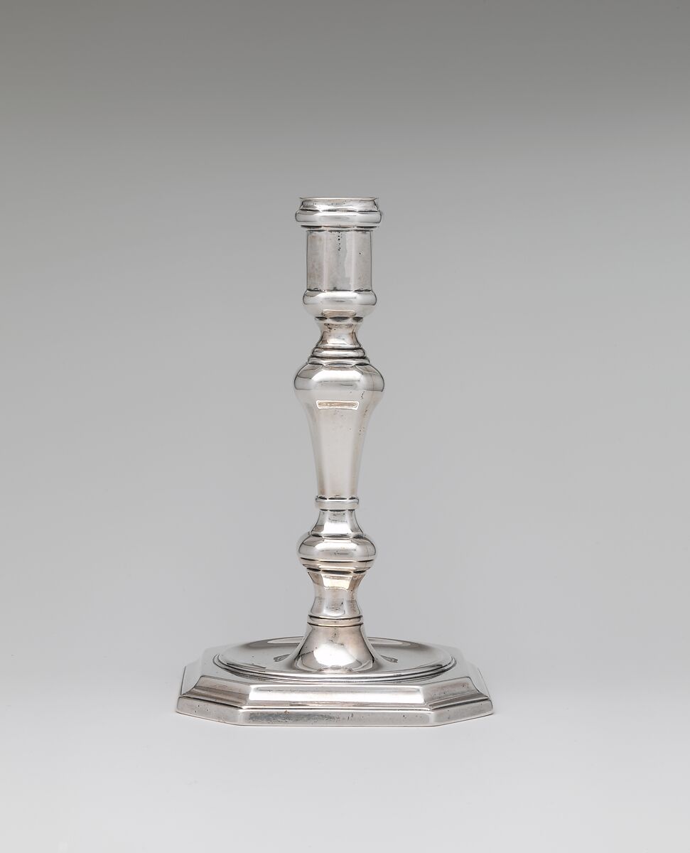 Early American candlesticks are extraordinarily rare; typically candlesticks that graced colonial American homes were imported from England or the Continent. For these, Adrian Bancker, a New York silversmith of Dutch descent, chose a traditional English form, yet their construction and appearance are unmistakably colonial North American. Although Bancker’s known oeuvre is small, the Met owns a significant collection of his silver, including a tankard (24.109.4), beaker (33.120.104), porringer (33.120.326), cream pot (44.88), punch bowl (48.15) and set of casters (1972.233.1–.3).