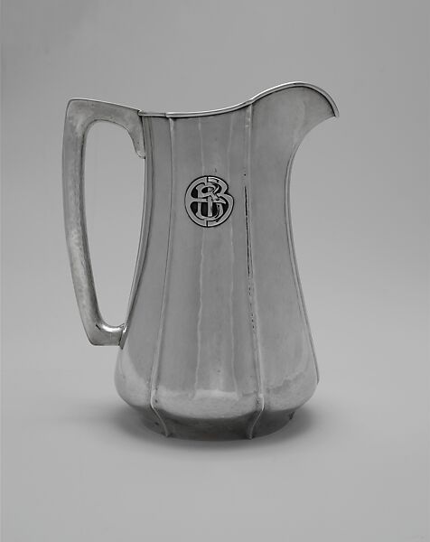 Among the earliest and most productive of Chicago’s Arts and Crafts silversmithing concerns, the Kalo Shop was founded in 1900 by Clara P. Barck. Under her management and that of her husband, George S. Welles, Kalo became a school and workshop for aspiring artisans, whose handwrought wares reflected the firm’s motto: "Beautiful, Useful, and Enduring." This paneled pitcher, with its gently rounded base and stylized monogram, "EBB," is one of Kalo’s classic designs.