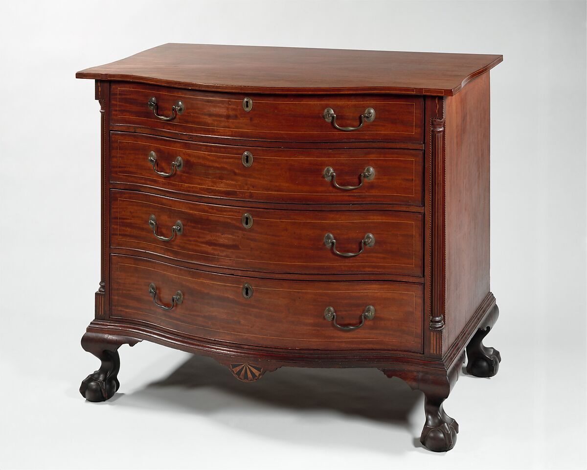 This chest is one of the most satisfying of late-eighteenth-century New England serpentine front chests. Its design is taut, linear, and self-contained. It perfectly combines Rococo form and Neoclassical ornament, capturing that time when one style was giving way to the other. The woods are finely figured and have good rich color.