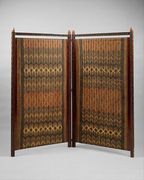 With its carved teak frame, vividly patterned plaited matting, and Japanese lacquer and mixed-metal finials, this unusual screen epitomizes the 1880s fascination with exotic styles and materials. The screen's designer, Lockwood de Forest, who was trained as a painter, did much to foster popular taste for such exoticism in decorative arts and architecture during the late nineteenth century. In 1881, with the ambition of reviving traditional methods of craftsmanship and indigenous designs, he established workshops in Ahmedabad, India, where carved woodwork was produced for use in American interiors and furniture. The workshops continued under his direction until 1907, when he turned over their management to Louis Comfort Tiffany. Over the years, de Forest amassed a sizeable collection of Indian, Tibetan, Chinese, and Persian objects, most of which were acquired by the Museum in 1915. While many of the items produced at the Ahmedabad Wood Carving Company were sold as stock items, others were custom made for a specific interior. This screen stood in the living room of Wawapek, the country house of Emily and Robert de Forest in Cold Spring, Long Island. (Robert, Lockwood’s older brother, was the president of The Metropolitan Museum of Art from 1913 to 1931). The screen’s multicolored matting complemented Emily’s collection of American Indian baskets, which was arranged on shelves in the room. With the Indian carving of its teak frame and its mixed-metal finials of Japanese sake cups, the screen exemplifies the tendency to blur distinctions among far-flung styles while creating "exotic" interiors.