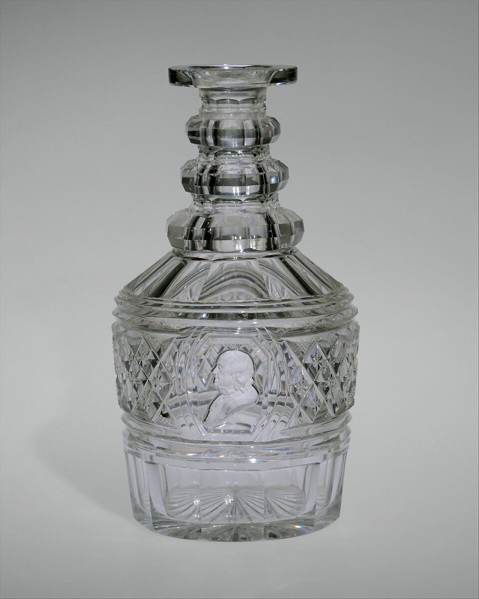One of a pair (its mate is in the Philadelphia Museum of Art), this decanter features elaborate cut decoration. It is distinguished by a sulphide portrait of Benjamin Franklin on the front. A difficult technique developed in Europe, a high-fired ceramic material is embedded into a bubble of glass, which is then deflated so the image is surrounded by glass. Highly fashionable in France, sulphide portrait decoration was first produced in America by the Pittsburgh firm Bakewell, Page, and Bakewell in 1825 in an effort to compete with European glass manufacturers. The Museum has two glass tumblers with sulphide portraits embedded in their bases, one depicting George Washington (1984.152), the other Lafayette (47.44).