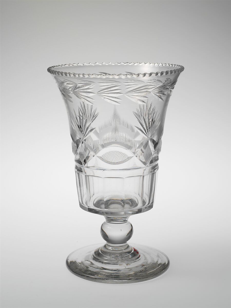 The cut decoration on this vase and on the nearby decanter and compote is a variation on the strawberry diamond-and-fan pattern, the most popular cut-glass pattern in the United States in the early nineteenth century. All of these pieces emulate the richly cut tableware