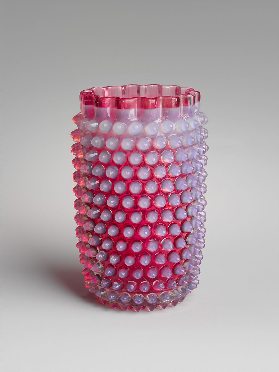 In 1886, Hobbs, Brockunier and Company patented an improved method of pressing opalescent glass. With subsequent cooling and reheating, the projecting nodules of the “Dewdrop” pattern would become slightly opaque, while the body remained translucent.