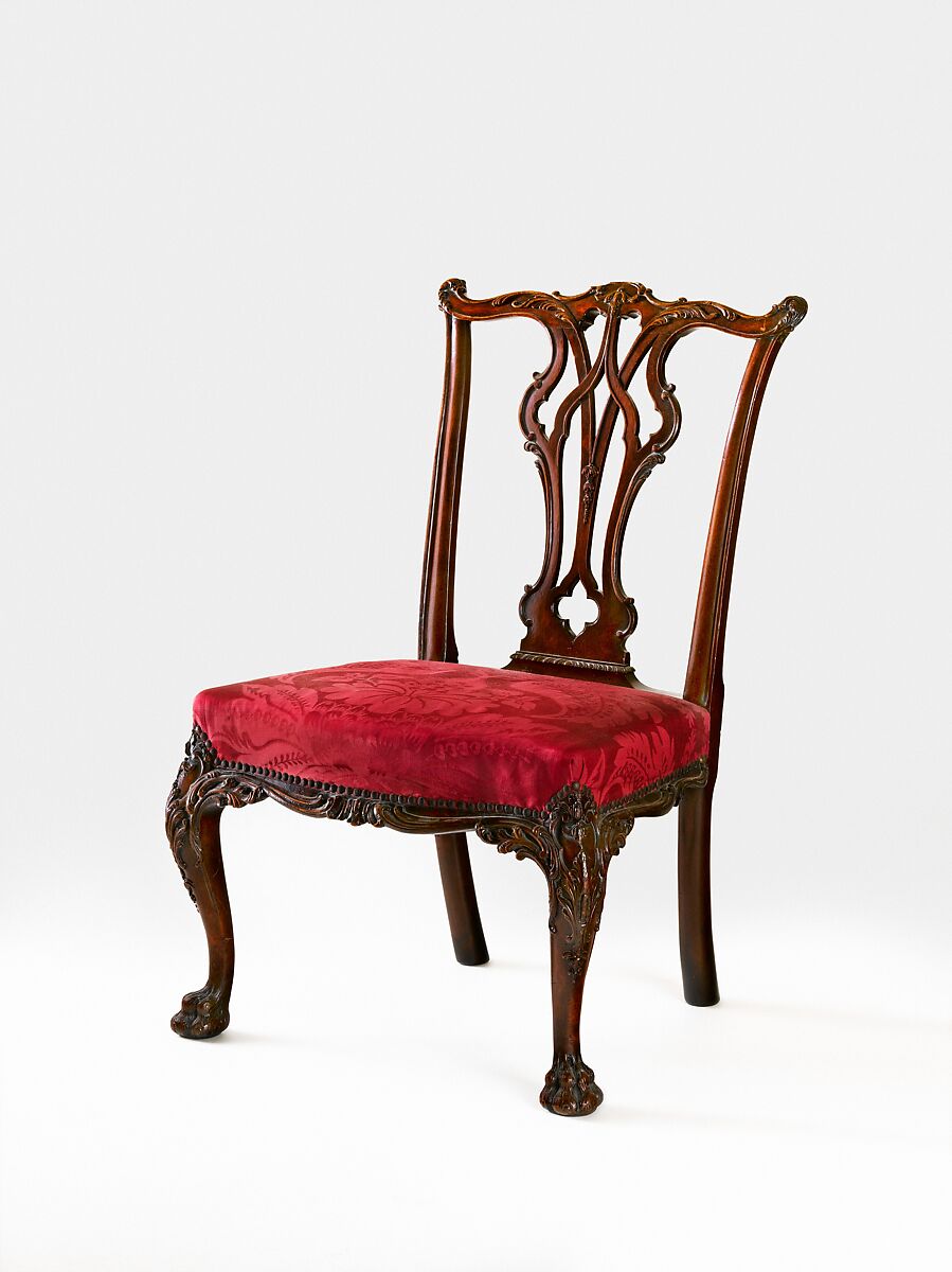 The squat proportions of the back of this chair and the carved rail skirts are suggestive of English work, but the oval rear legs, side rails with through tenons, and design and carving of the back are in the classic Philadelphia manner. The refined carving that accentuates the integrated design of the crest and splat represents the fullest development of the Gothic splat pattern in Philadelphia. The hairy paw feet are a restoration.