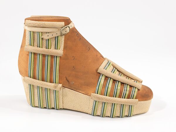 While its specific design details are unique, this design corresponds to contemporary importance of sandal upper and platform sole, two of the strongest trends in the late 1930s. Arpad slits narrow bands of striped leather through rolled strips of white pigskin to create a novel and intriguing design.