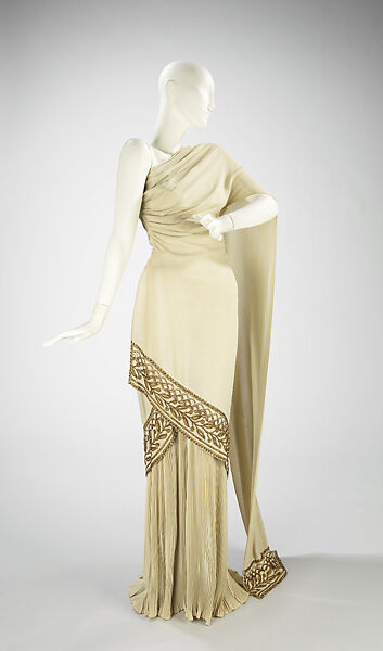 This elegant evening dress is a superb adaptation of a classical garment for modern-day dress. The upper portion of the dress resembles a Greek chlamys or a Roman palla, while the fluted skirt mimics the bottom half of a Roman stola.