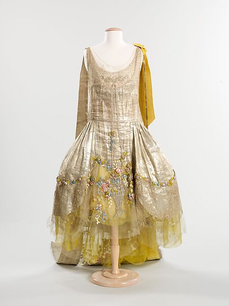 Protocol regulated the formal attire for men and women who were to be presented at the Court of St. James in London, until the custom was ended in the 20th century. The long train emanating from the shoulders of this gown suggest it may have been worn to for a court presentation in the mid-1920s. An example of the silhouette known as a "robe de style," in which interior boning widens the skirt at either side, the dress was custom-made in the Boué Soeurs atelier. The lamé fabric, paired with a virtuoso examples of ribbon work, identify its couture origins. The elaborate craftsmanship of these elegant ornaments, arranged in a floral basket design, are a characteristic feature of gowns made by the Boué sisters.