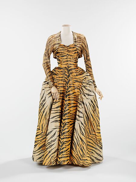 While he often incorporated animal motifs or patterns in designs throughout his career, Adrian likely found new inspiration for this dramatic dress during an African safari the designer took with his wife, the actress Janet Gaynor (1906-1984) in 1949. The choice of a bold textile, custom-made for Adrian by the French house of Bianchini Ferrier, ensured the dress received significant attention in the fashion press that season. Gaynor wore this gown to an event at the Los Angeles showroom and headquarters of Adrian Ltd. in Los Angeles and later donated it to the Brooklyn Museum's collection.