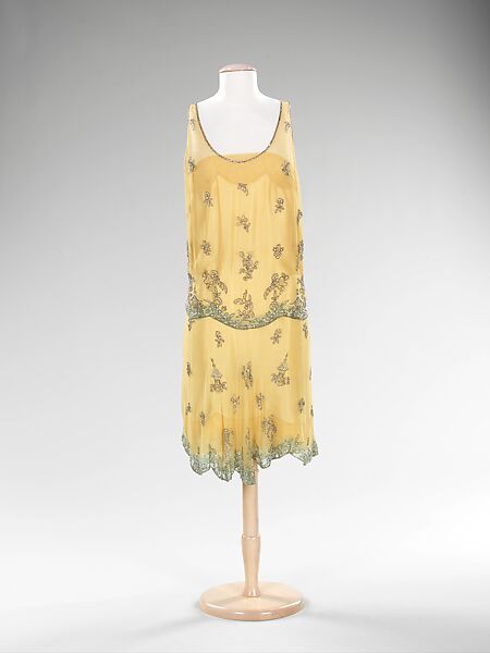 This elaborately beaded evening dress is a wonderful representation of Hoyt's work. Known for her use of rhinestone ornamentation, the pattern seen here expresses the freedom she took in design creativity. As the flapper style was still in vogue, this would have been an exquisite piece for any of Hoyt's clientele to wear for a night on the town.