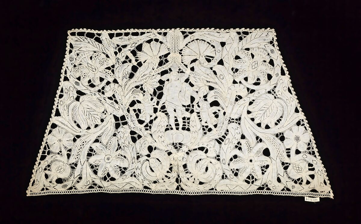 This fine design, in w hich the lace pattern fills up the entire piece, is characterized by intricate patterning within the motifs. The central male Christian figure, representing either a saint or Christ, is atypical of imagery seen in lace accessories.