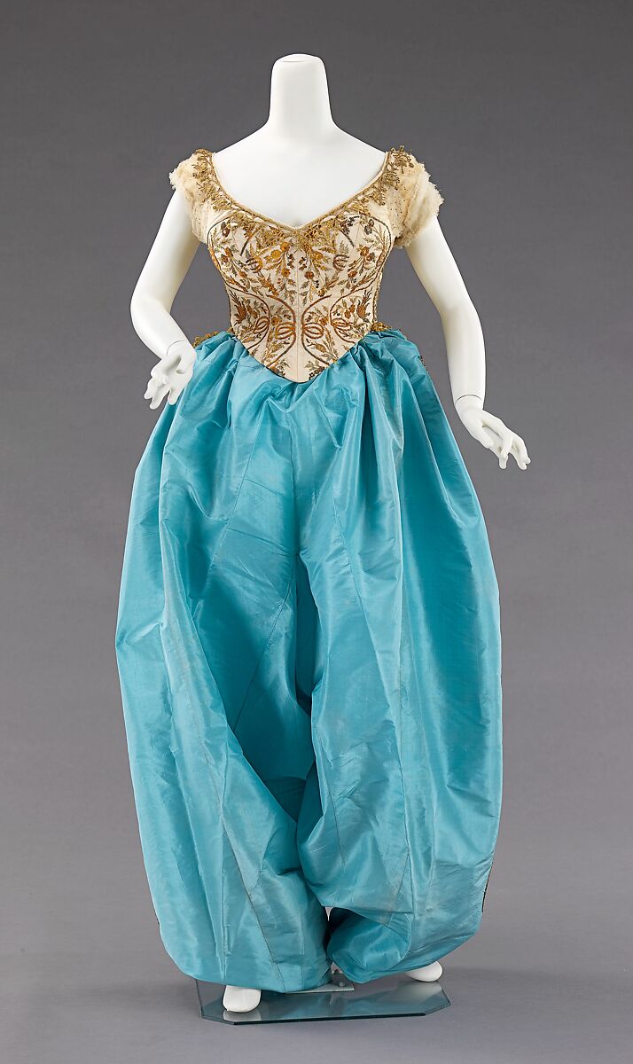 This Turkish style costume exhibits the European and American fascination with Turkish dress which stems from the 18th century and endured throughout the 19th and early 20th centuries. This trend culminated in 1911 with Paul Poiret's "harem" pants and Turkish themed fancy dress ball, "1002nd Night." This style of pants also saw widespread use in the early 19th century for water exercises.