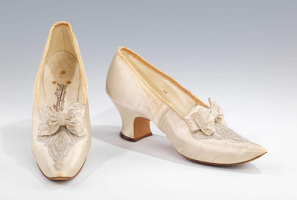 While shoe fashions vary in the United States and Europe, French designs have always held a certain cachet that secures them a place in the market. The short, pointed upturned toe of this pair of slippers reflects French taste in the 1890s, and suggests that the shoes were either imported by the New York vendor or deliberately made in the French style for a special clientele. American-made shoes of this period tend to have a notably longer toe. The shoes are well made with attractive embroidery on the vamp in a motif typical for the period. The robust standing bow serves to compliments toe shape.