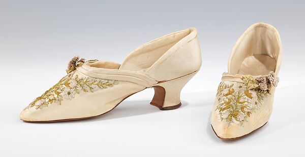 The airy, ultra feminine style of Edwardian fashion found no better environment for its full expression than the bedroom and boudoir. This pair of dainty slippers features skillfully wrought and subtly hued pastel ribbonwork embroidery, nicely complimented by three-dimensional flowers at the throat. A flirtatious note is added by the curvaceous Louis heel and the flesh-baring d'Orsay cut, which was originally popularized as a men’s style by French amateur artist and dandy Alfred Guillaume Gabriel, Count d'Orsay (1801–1852).