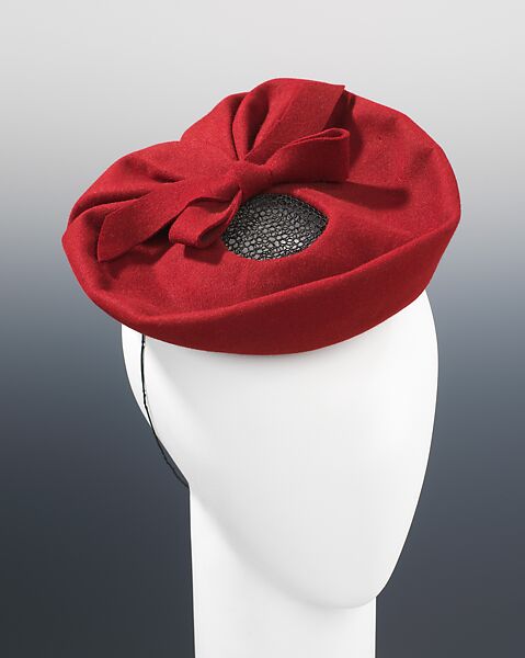 While not all were as tiny as the "doll hats" in fashion at the time, hats of the late 1930s and early 40s generally had a more modest profile than those of previous decade. In this example, the facility of the designer shows in the folding and pleating of the cherry-red felt, rather than in the use of more ostentatious trimming. This tasteful restraint in ornamentation and the skill evident in its shaping give the hat a certain Parisian chic. The donor of this hat gave several similar hats, showing a preference for this size and style.