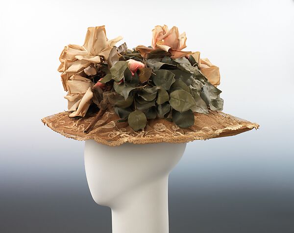 The mixing of materials was an important design feature in fashions of the 1900s, and the milliner of this hat has accordingly demonstrated her inventiveness and sensitivity to current trends by overlaying the straw with lace, a material which was also a prevalent element of contemporary clothing. While retaining a feminine air, the hat is given a boldness characteristic of the period by the use of a fairly coarse lace and by the large and abundant flowers trimming the oversize crown. The superb workmanship and extreme realism of the flowers attest to the craft of flower making as an art in itself.