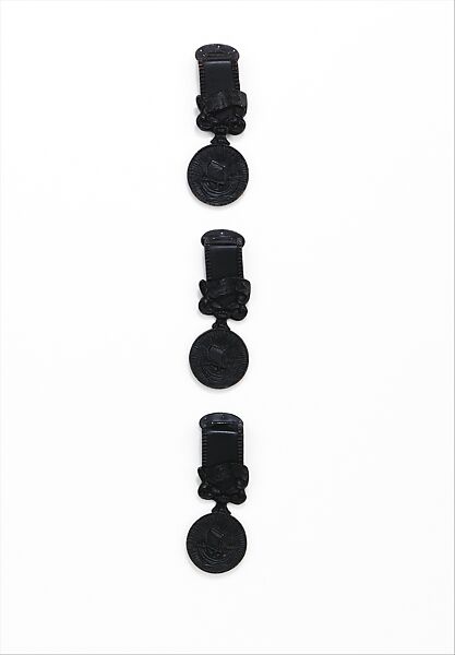 In 1937, Paris hosted an Exposition or World's Fair. Referred to as "Paris 1937," the Exposition included six different shows and museum openings, including "L'Exposition Internationale des Arts et Techniques dans la Vie Moderne," which emphasized arts and techniques of the modern age and included a "Pavillon de l'Elégance," a showcase of the work of various couturiers including Schiaparelli. For her fall 1937 collection, Schiaparelli designed several pieces inspired by the upcoming Exposition, including these ornamental buttons inscribed with "Paris 1937." The motif of a ship sailing on a turbulent sea depicted on the trompe l'oeil medals is the same motif pictured on the coat of arms of Paris, in use since 1358. The buttons, representative of a medal hanging from a ribbon and made of cast metal alloy, are an example of a typical Schiaparelli design device in that the object is created in a material that is the antithesis of the silk and precious metal used to make an actual medal.