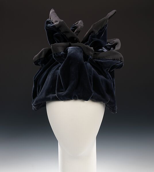 The unique form of this whimsical hat, constructed by gathering up a large wired square of velvet over a rigid helmet-like foundation, shows the experimental and playful element being injected into millinery designs of the period. Although the specific form and construction is unusual, the vertical emphasis and somewhat stiff, vigorous projections are characteristic of styles around 1912-1915. This hat comes from the estate of Mrs. Arthur F. Schermerhorn, whose wardrobe is represented in the collection by numerous other creative and interesting items of French couture from the same period.